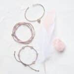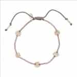 Dit is de Botanic Rozenkwarts Zilverkleurige Armband van A Beautiful Story. Deze betekenisvolle armband bestaat uit rozenkwarts edelstenen, zilverkleurige glaskralen en messing kralen met de hand geregen op een katoenen draad. De rozenkwarts edelstenen en de zilverkleurige glaskralen vormen samen vijf bloemen. De armband heeft een verstelbare lengte van 16-22 centimeter.
