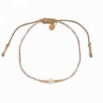 Deze armband van glaskralen, messing kralen en een kleine rozenkwarts edelsteen is geregen op draad. Het schuifslot is van katoendraad.