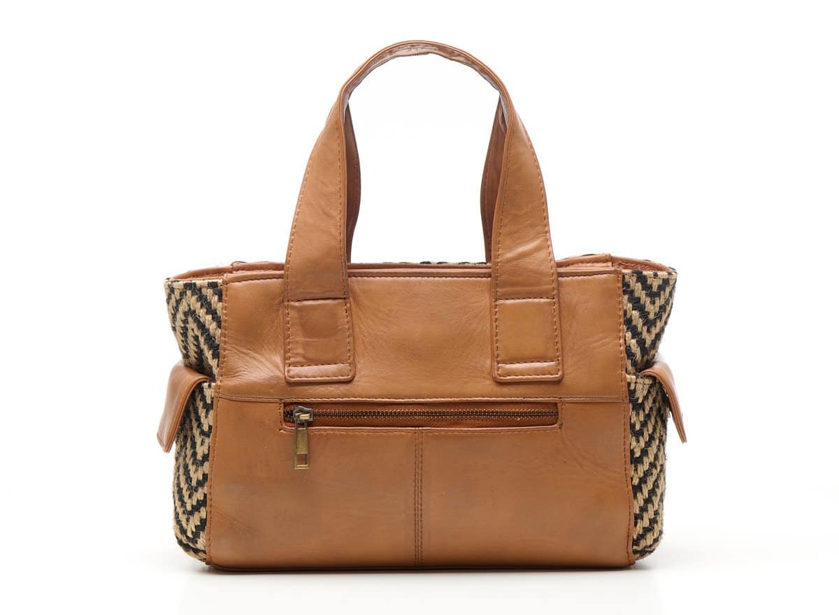 De zijkanten van de tas zijn uitgevoerd in stijlvolle jacquardstof en afgewerkt met leren klepjes. De onderzijde heeft een volledig leren bodem – voor extra stevigheid en een luxe finish.