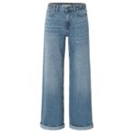 Deze denim broek is gemaakt van stevig katoen en heeft een hoge taille en een oversized, losvallende pasvorm. De wijde pijpen zijn bedoeld om omgeslagen te dragen voor een nonchalante, casual look. Voorzien van steekzakken, achterzakken en riemlussen.De lengtemaat van deze broek is 32.